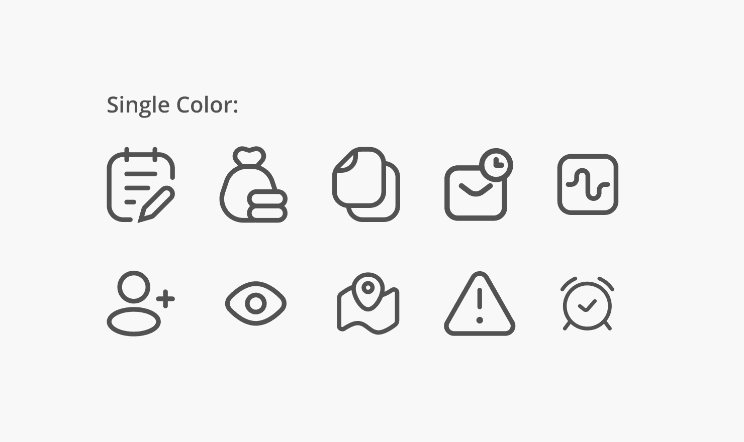 Solid color icons: Icons can be rendered entirely in a solid color from our palette, or neutral tones (white or black).