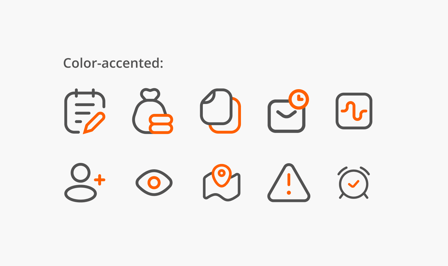 Our iconography follows a clean, modern style with the option for color accents to add vibrancy. Icons can either feature a color-accented design or a solid color treatment using our brand palette.